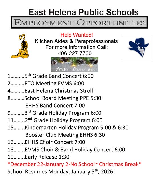East Helena Celebrating 25 Years Holiday Carols with Helena Express Singers, Saturday the 13th at 11 am. The Friends of the Library are hosting the Helena Express Singers for some seasonal caroling. Hot cocoa and light snacks will be available. All ages are welcome.