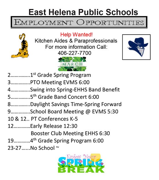 East Helena Public Schools (EHPS) operates three elementary, one middle, and one high school with a student population of more than 1,950 annually. The district strives to maintain strong connections between teachers and parents, maintaining a “small town feel” in one of the largest Class A districts in the state. As one of Montana’s newest high schools, East Helena High School is the pride of the community and continues to grow and expand offerings for academics as well as athletics and activities. CONTACT: Dan Rispens, Superintendent, drispens@ehps.k12.mt.us, 406-227-7700